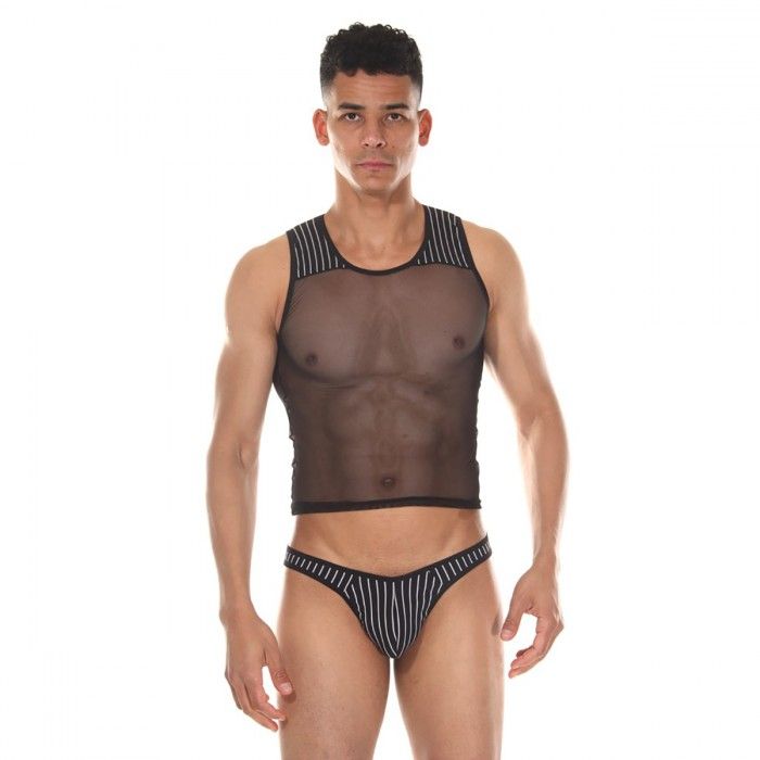 Мужской комплект, состоящий из трусов-тонг, черных в тонкую белую полоску, и короткой майки на широких лямках. Сама майка из полупрозрачной тонкой очень мелкой сетки, на плечах вставки из материала в белую полоску, такого же, как на тонгах. В комплекте: майка, трусы.