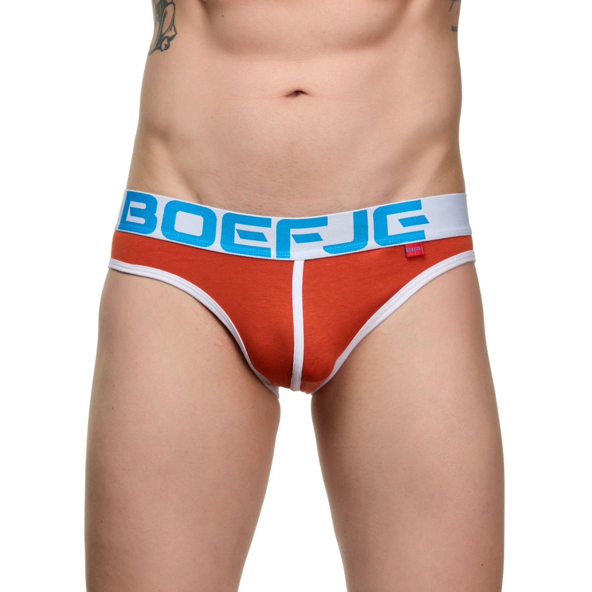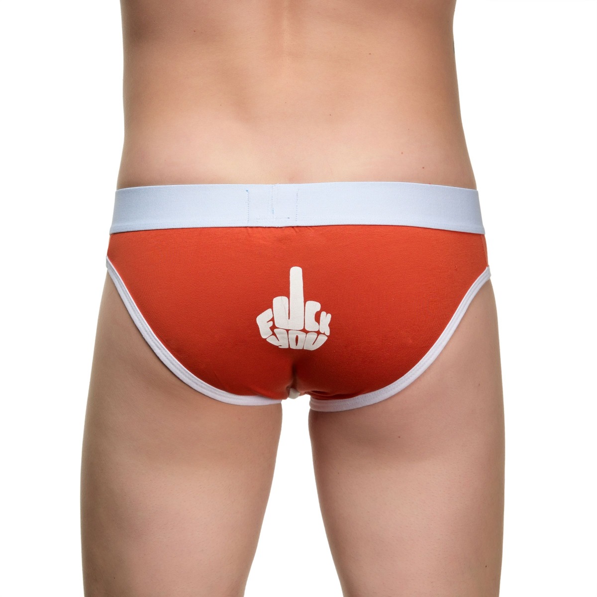 Оранжевые мужские трусы-слипы с провокационной надписью на задней части.