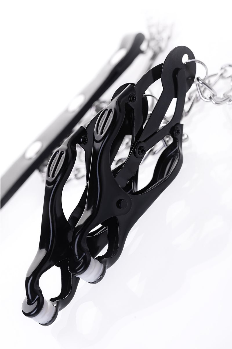 Мужская версия зажимов для воздействия на соски. Конструкция с пружинным механизмов - один из самых жестких вариантов. Дополнительное ограничение свободы обеспечивает мягкое кольцо на пенис. Длина сцепки - 48,5 см. Длина зажимов - 9 см. Диаметр кольца - 3,5 см.