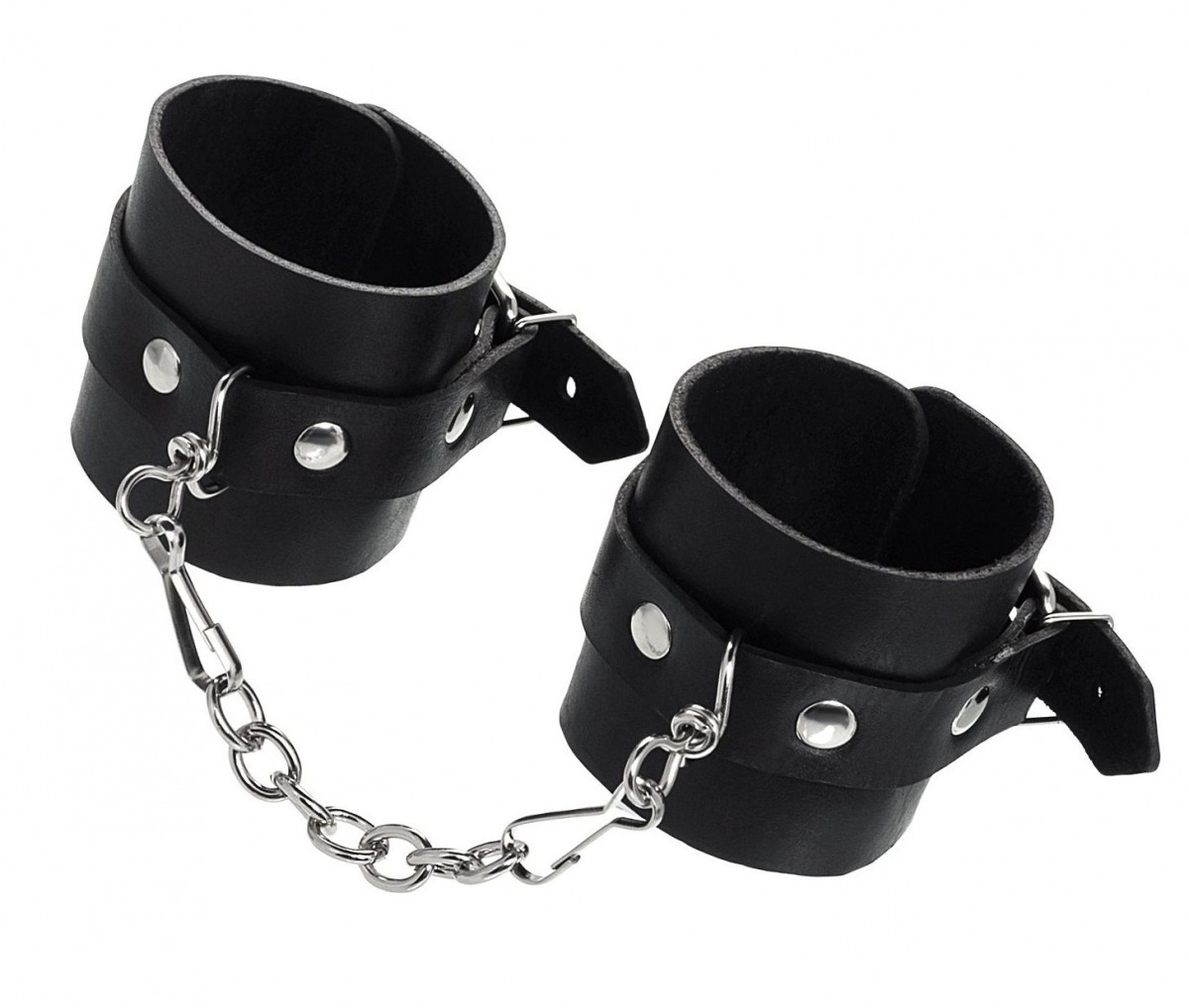Однослойные кожаные наручники могут стать стильным аксессуаром на «свободных» руках, но могут послужить вашим целям и фантазиям по своему прямому назначению. Наличие двух карабинов и колец позволяет использовать изделие как раздельно – аксессуар-манжеты, так и как наручники для фиксации. К широким металлическим кольцам также можно присоединить и другие аксессуары при помощи карабинов. Благодаря универсальному размеру наручники могут использоваться и мужчинами, и женщинами. Размер легко регулируется с помощью металлических пряжек, органично вписывающихся в общий стиль. Длина манжет - 25 см, ширина - 5,5 см. Длина сцепки - 13 см.