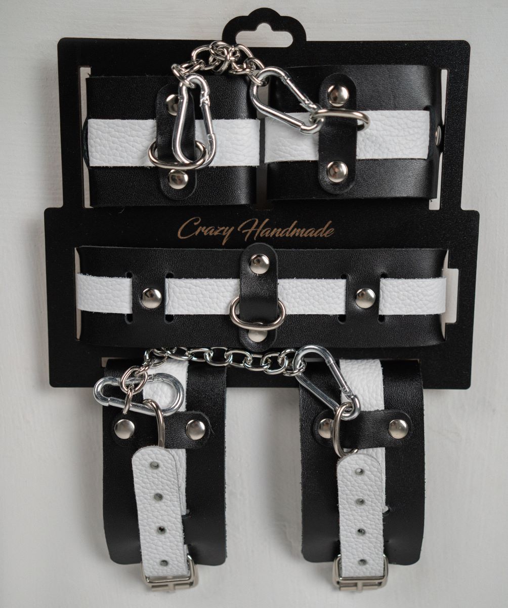В набор входит ошейник, наручники и оковы. Доставляется в фирменной упаковке в виде брендированной деревянной подложки. Ошейник состоит из двух элементов: основа прямоугольной формы из натуральной кожи черного цвета и ремешок белого цвета с прочной хромированной фурнитурой в виде овального кольца. Расположение ремешка через прорези основной части является декоративным решением, а также служит для лучшей регулировки размера. Наручники состоят из двух деталей: основа прямоугольной формы из натуральной кожи черного цвета и ремешок белого цвета с прочной хромированной фурнитурой в виде овального кольца. Расположение ремешка через прорези основной части является декоративным решением, а также служит для лучшей регулировки размера. В комплект входит соединительная цепочка с двумя карабинами. Оковы состоят из двух деталей: основа прямоугольной формы из натуральной кожи черного цвета и ремешок белого цвета с прочной хромированной фурнитурой в виде овального кольца. Расположение ремешка через прорези основной части является декоративным решением, а также служит для лучшей регулировки размера. В комплект входит соединительная цепочка с двумя карабинами. Длина ошейника - 47 см, ширина - 5,5 см, обхват - 34-44 см. Длина наручников - 25 см, ширина - 6 см, обхват - 15-22 см. Длина оков - 32 см, ширина - 6 см, обхват - 20-29 см.