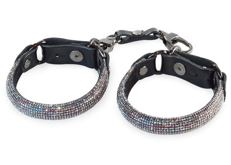 Сверкающие наручники украсят Ваше тело, добавят в Ваш образ шика и особой сексуальности. Внутренняя сторона наручников велюровая, лицевая - усеяна множеством сверкающих кристаллов. Застегиваются при помощи лакового ремешка и кобурной кнопки. В комплекте с наручниками идет перемычка с двумя карабинами. Девайс можно использовать как браслет. Обхват запястья - 19-20 см.